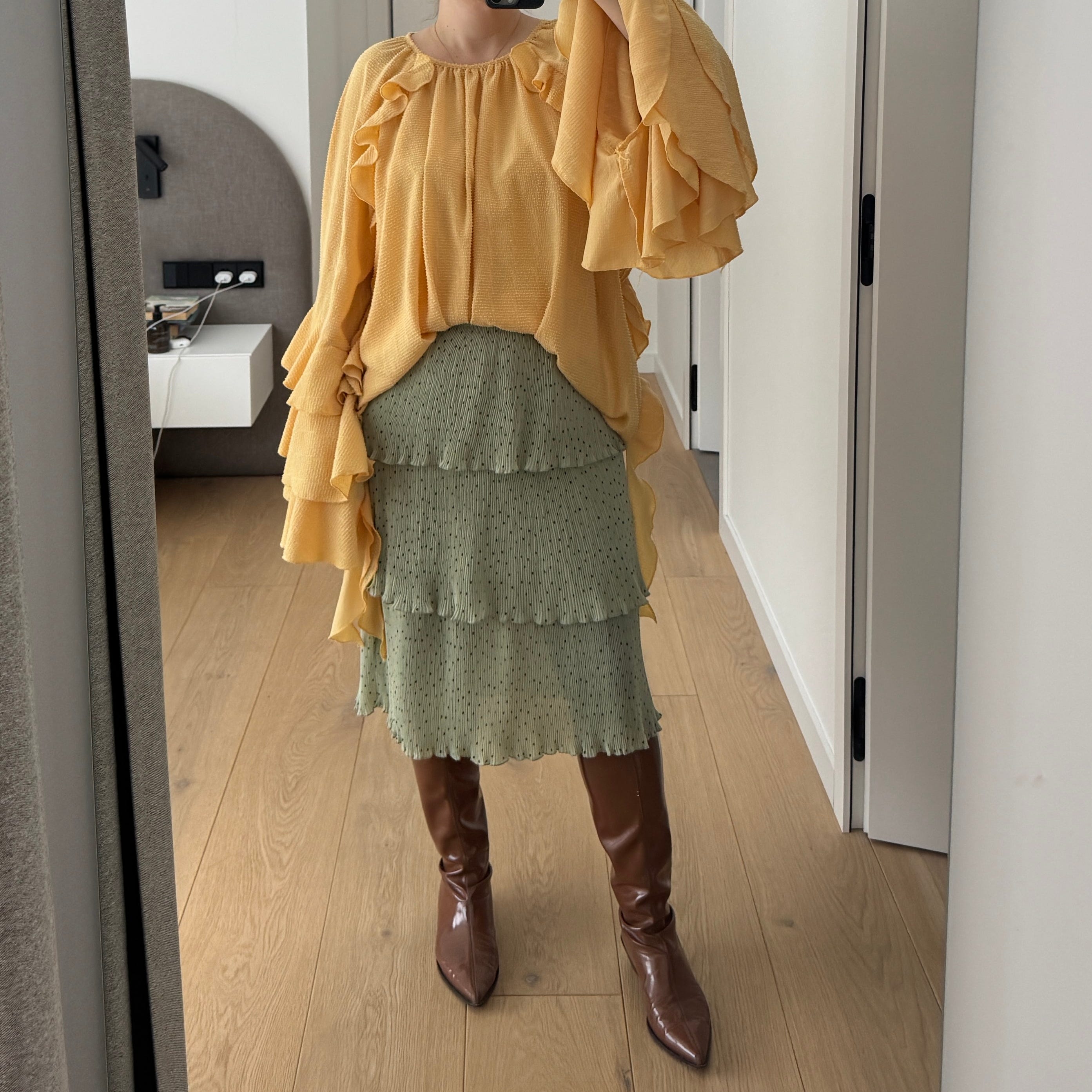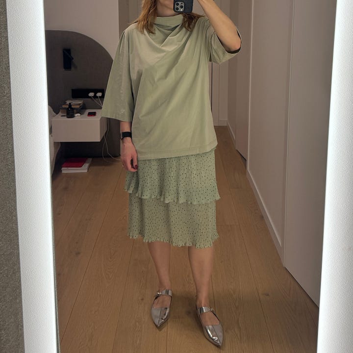 Now, the top in this outfit is something - and it is not particularly high-quality, which damages its look - but otherwise it still has a direction and a relaxed vibe. However, what I truly dislike is the skirt. It feels so girly and so cute. And this does not say anything about the skirt itself - just psychologically, I cannot stand it. A recent post by Laura Kirk De Valencia raised some thoughts on this topic, and I believe I do not like these girly clothes because they remind me of women being powerless and just cute, with no say over anything. It also does not help that there is pretty bad color matching with green and yellow, which I do not really like. Nevertheless, I powered through.