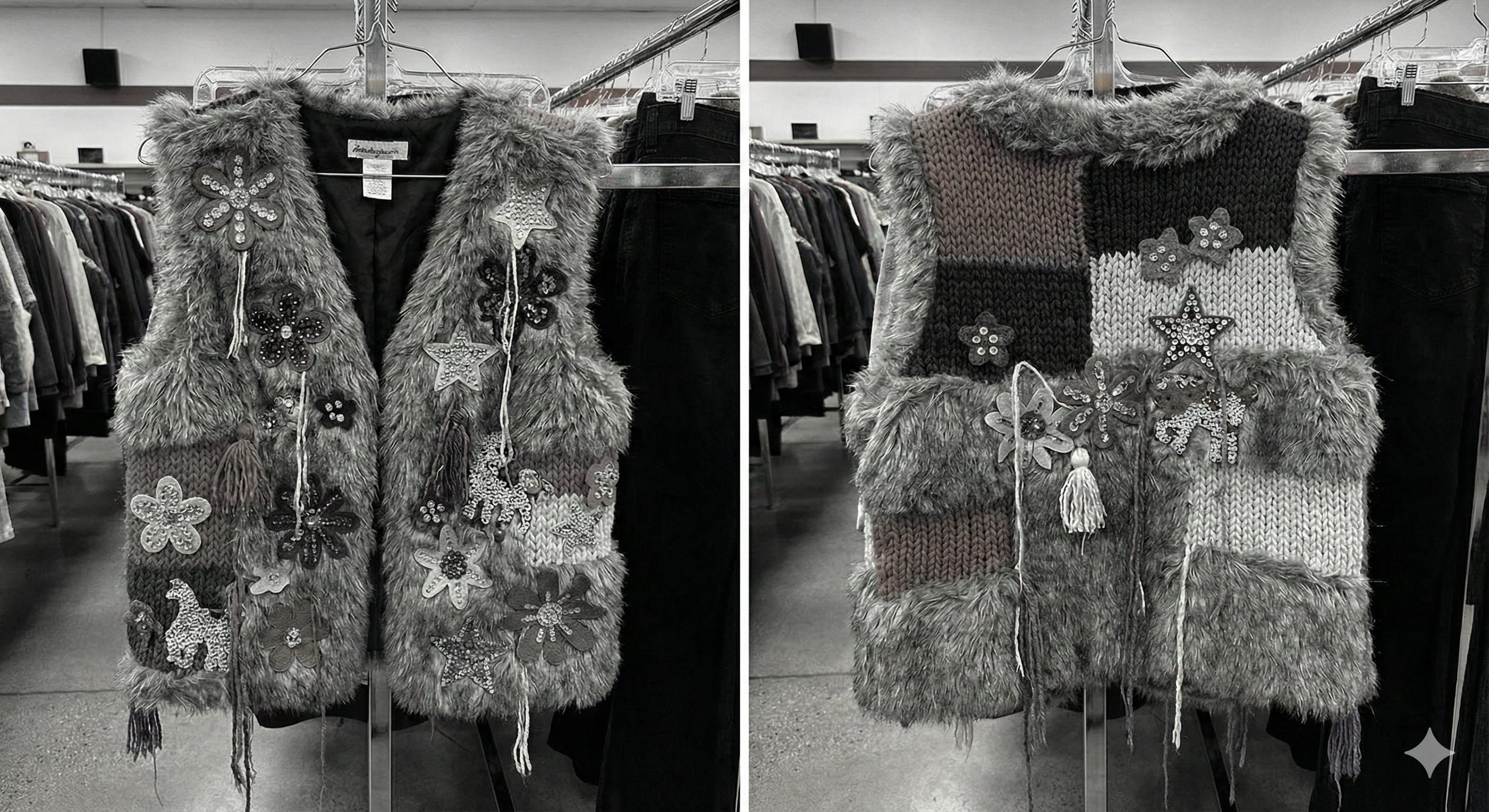 This shopping was very interesting. I picked up only things that I really felt strong dislike for. Interestingly enough, there were many pieces I disliked. For example, I stumbled upon a half-fur, half-knitted vest with many leather and fake diamond details. Another piece was a T-shirt with a not-high-not-low décolleté, very small ruffles, and a rose composition on top of black ruffles. I noticed that, like in design in general, when a piece tries to be everything to everyone, that is when truly bad design appears.