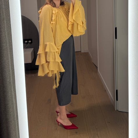 So what are the conclusions of this experiment for feminine ruffles girly? An over-the-top outfit does not go unnoticed, for sure, and it can be hard in difficult environments. But in a supportive environment, experimentation can be so fun. And remember, I picked up clothes I truly dislike to try this out - and still could make a decent outfit by pairing them with my regular pieces. On the contrary, the ruffled piece actually brought in some patina and some oomph to my usually modern and rather minimalistic outfits. So maybe I was just imposing mental limits for my style? Perhaps it makes a lot of sense to try things you do not like and avoid limiting ourselves?