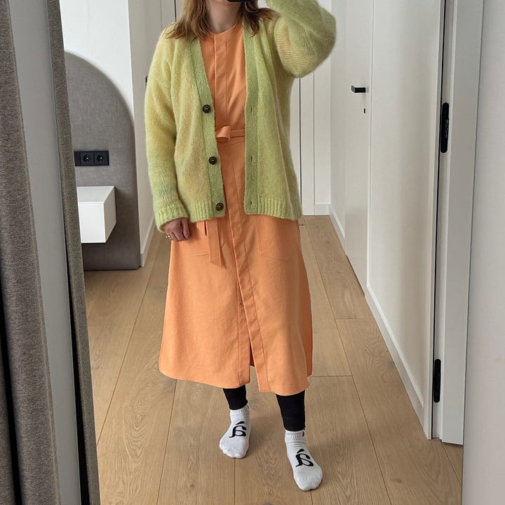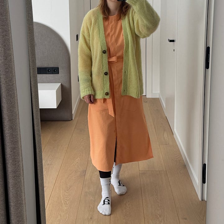 I then decided to lean into the infamous “two,” where mismatching pieces come in pairs. I tried the apricot dress from Tibi with my recent new addition - a Salanida sweater in lime - and this color combo just did not work (although lime usually works with almost everything). Maybe they’re too close to each other on the color wheel and/or have the same intensity?