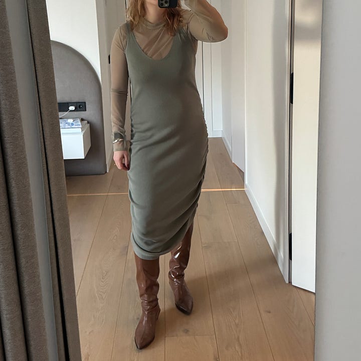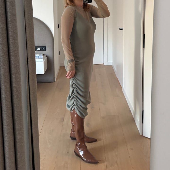 To be honest, I love this outfit. I love the sheer turtleneck under the sage green dress with draping that I had done by a tailor. I love the color combination of green and brown. I love how it is still relaxed, soft, and feminine, and in line with my style. In general, I feel like it is a very good outfit.