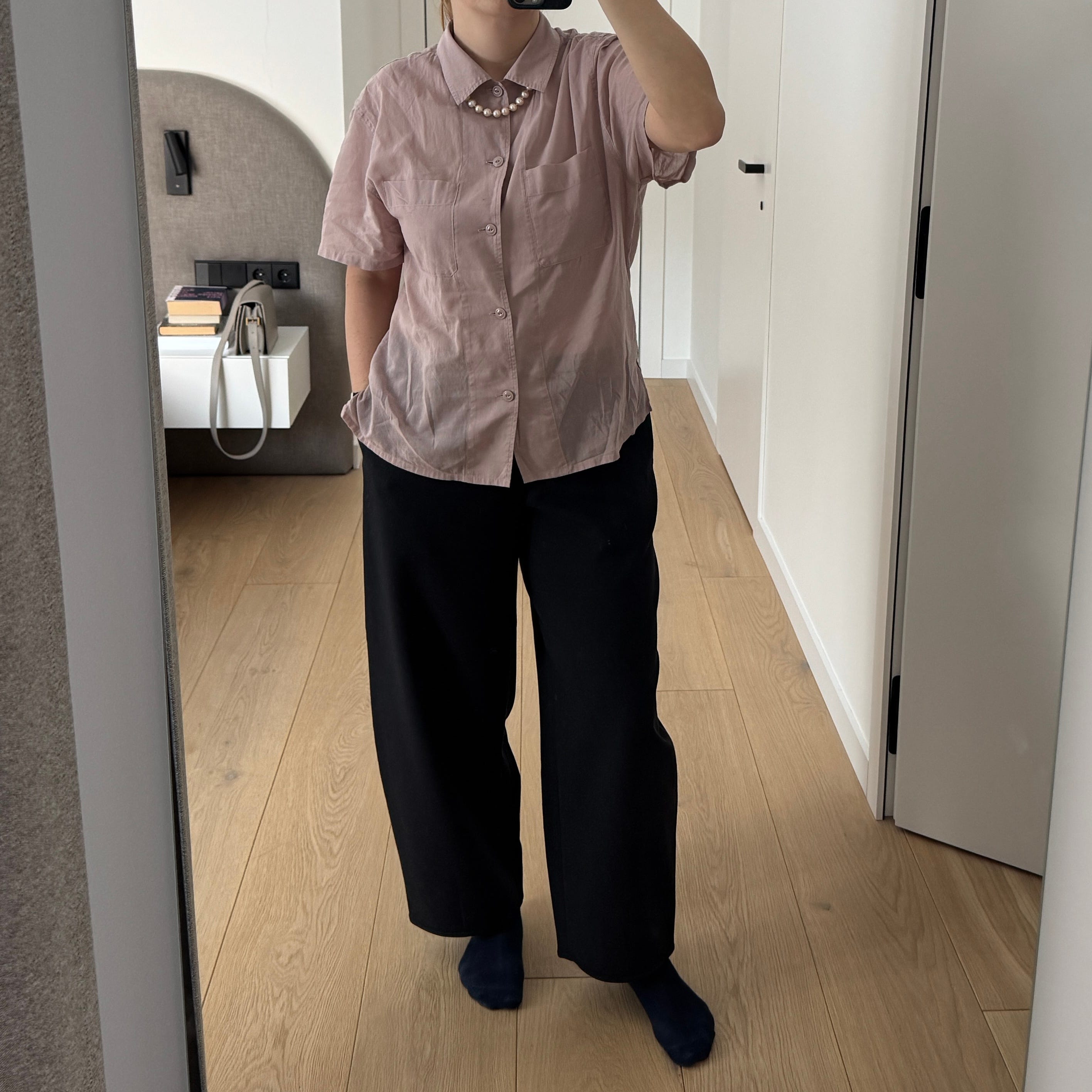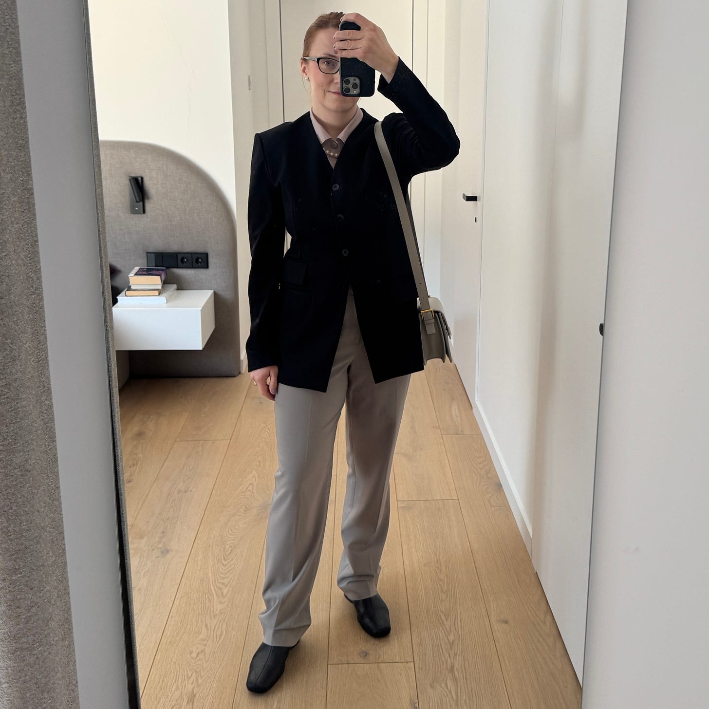 For the clothes, I pulled my Tibi pants, Tibi blazer, and Vagabond shoes. I then added a button-up shirt from Uniqlo and pearl necklace and earrings. Mind you, the fact that the pants and blazer are Tibi already brings in some chill and modern vibe - but I did not want to buy a suit (even second-hand) that I would never wear. I made an effort to button everything up, tuck in my shirt, and button the blazer - and I ended up with the following look: