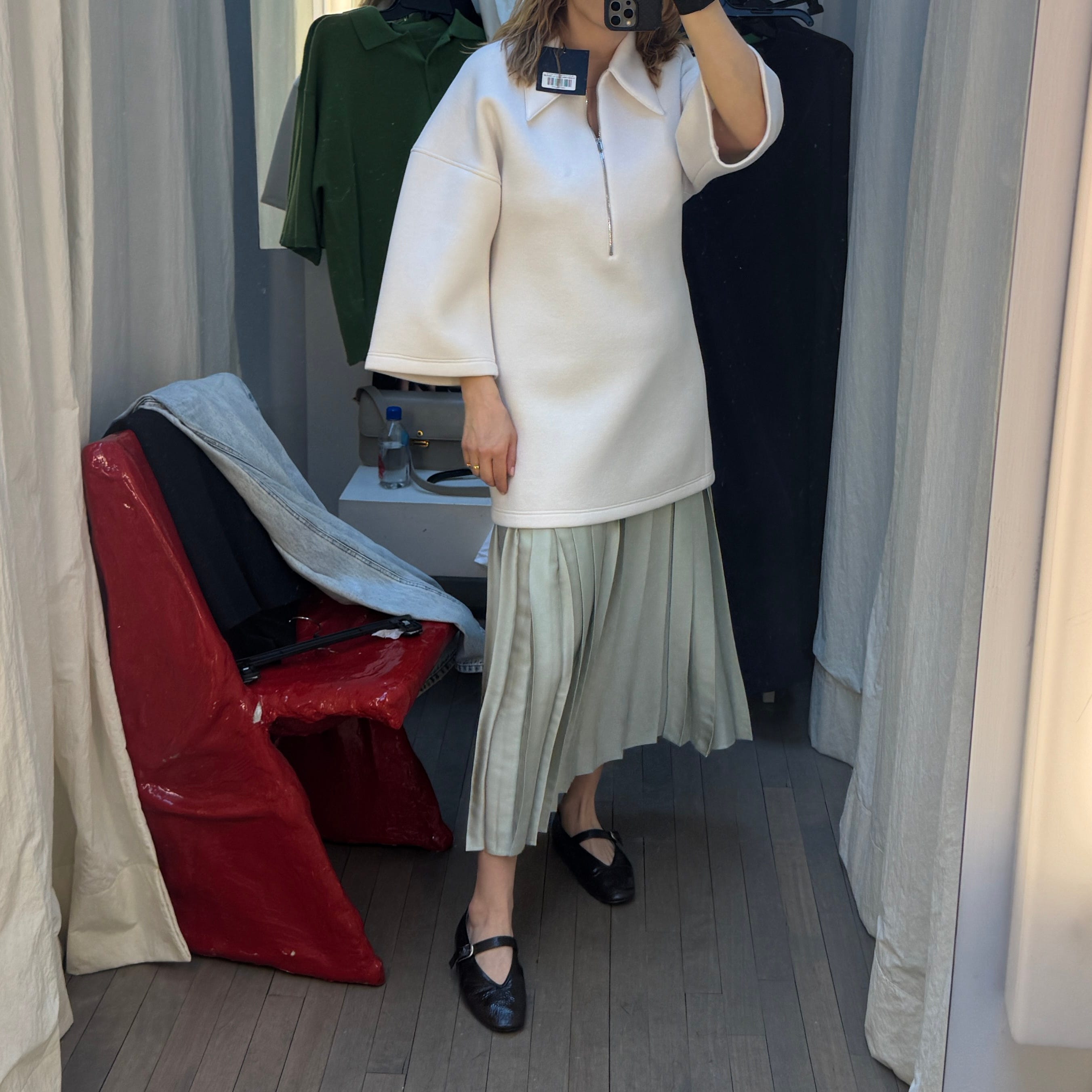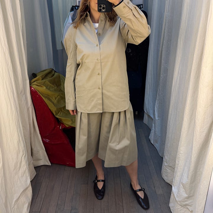 This tunic was really something when I tried it on. It felt so fresh and clean and looked amazing on me. The fabric feels almost like a sweatshirt, but it holds its shape really well. The reason it did not win, though, is that it has different proportions than usual. I would not wear it as a mini dress because it is quite short, and that leaves wearing it over pants or skirts, which would require a lot of figuring out. It also did not really pass the WFH test. I felt like the color would get dirty quickly, and I avoid anything fussy. Still, I am keeping an eye on it for the sale period.