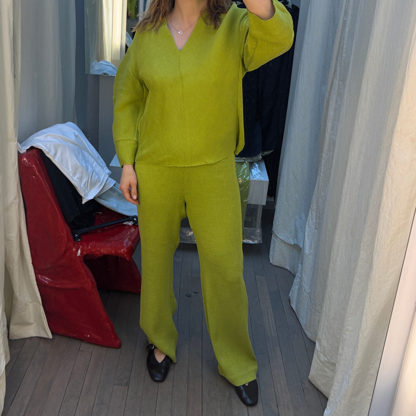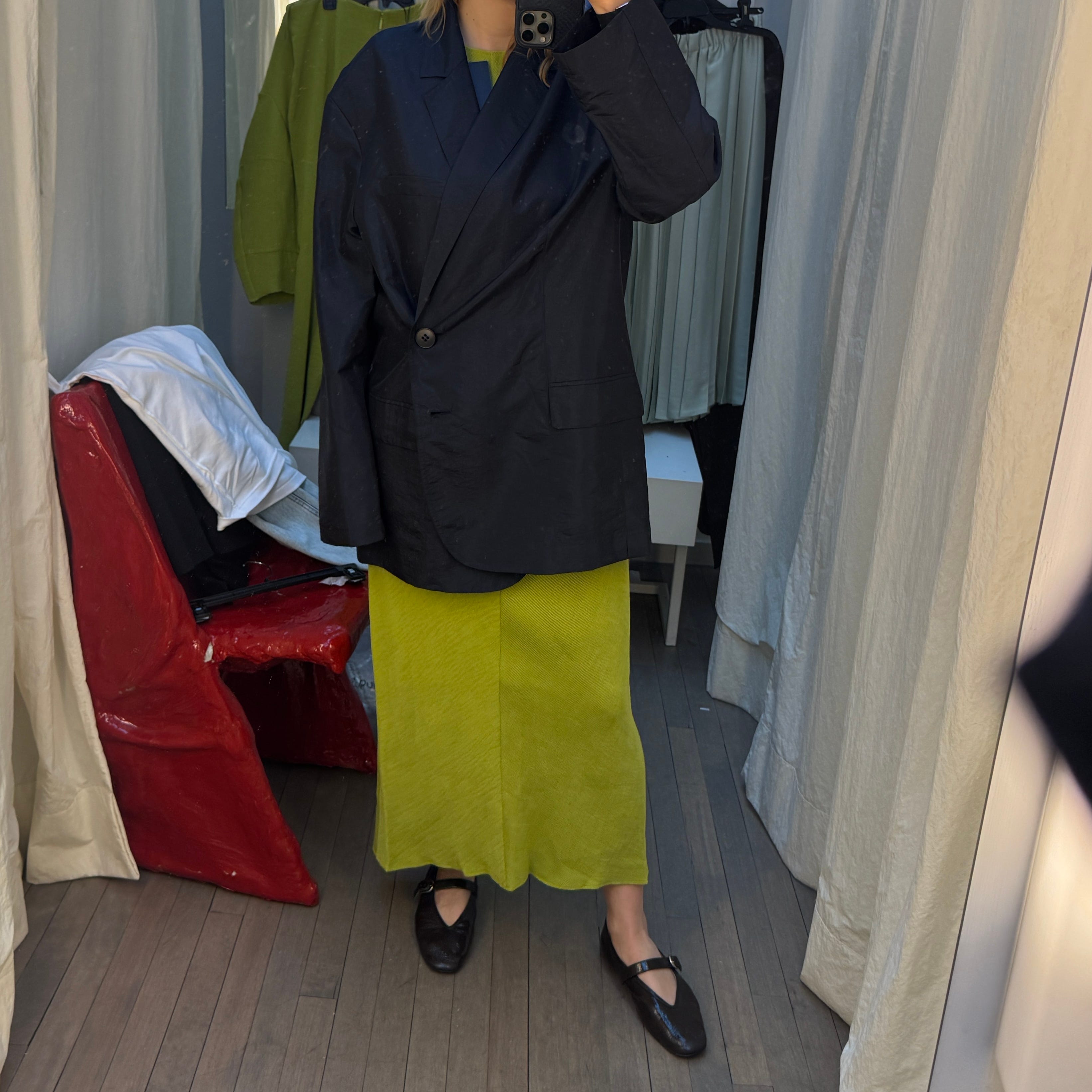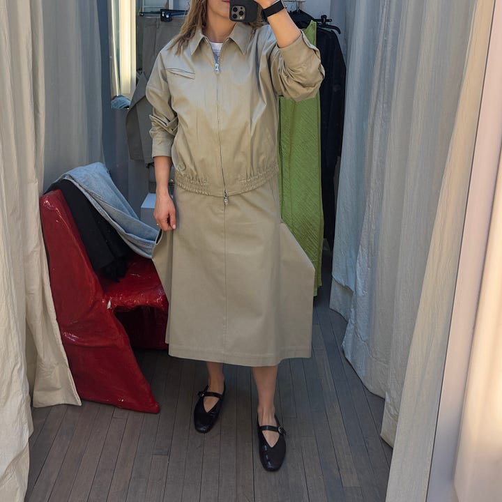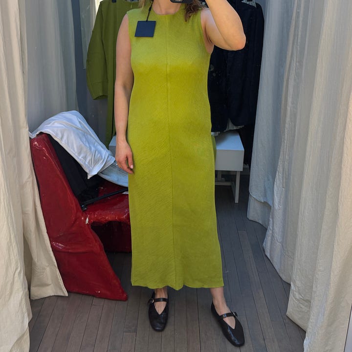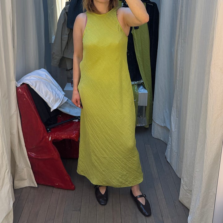 I also tried this chartreuse set and quite liked it. It felt like a good alternative to an all-beige old-money outfit. Still, it felt a bit too unstructured for my body type, so I passed.