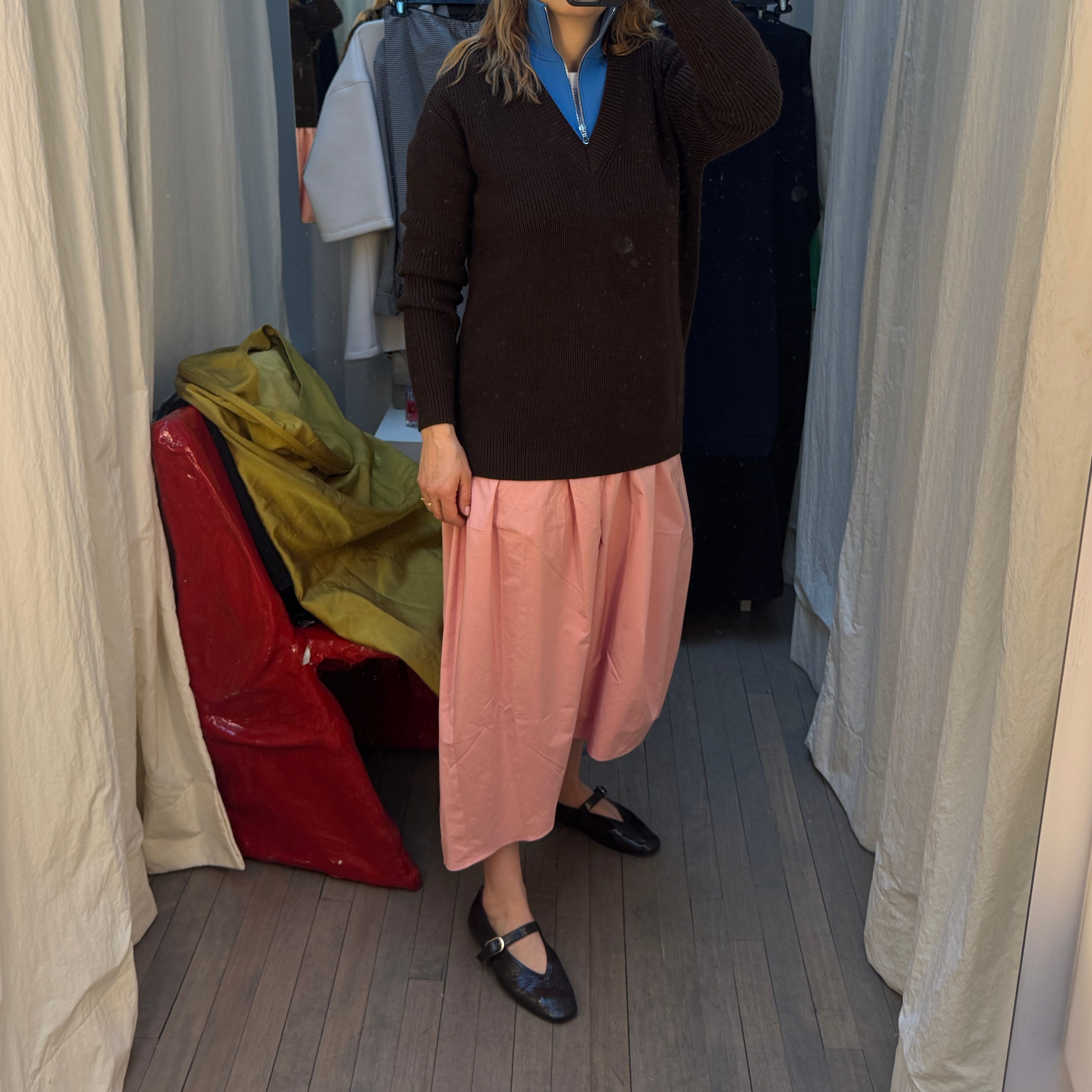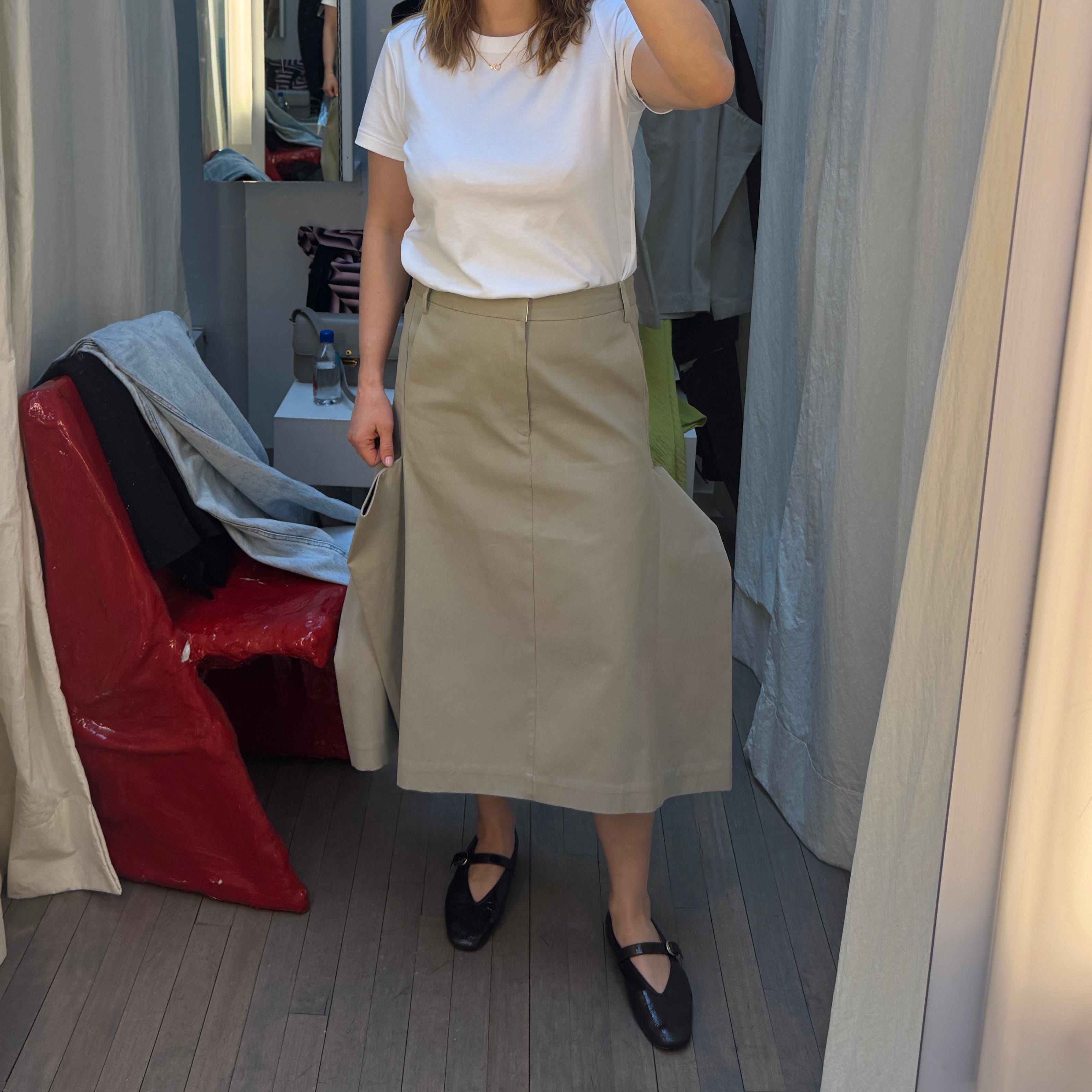 I noticed this skirt in Style Class, in Vienna Tibi styling, and even on the runway. I loved its proportions. It is modern and “big,” but without the usual elaborate pleats and volume around the waist, which Tibi loves and of which I already have enough “natural pleats” there myself. It had the perfect waist, and then the pleats started much lower, bringing an extremely modern hourglass proportion to the whole look. I think it is just great. Aside from being very flattering, it feels very directional, but you can still wear it with anything. I can see myself wearing it with a simple T-shirt during the summer or with a blouse that can be partially tucked in. The fabric is 100% cotton, which I love, and the color is extremely versatile, although the brown version is just as versatile too.