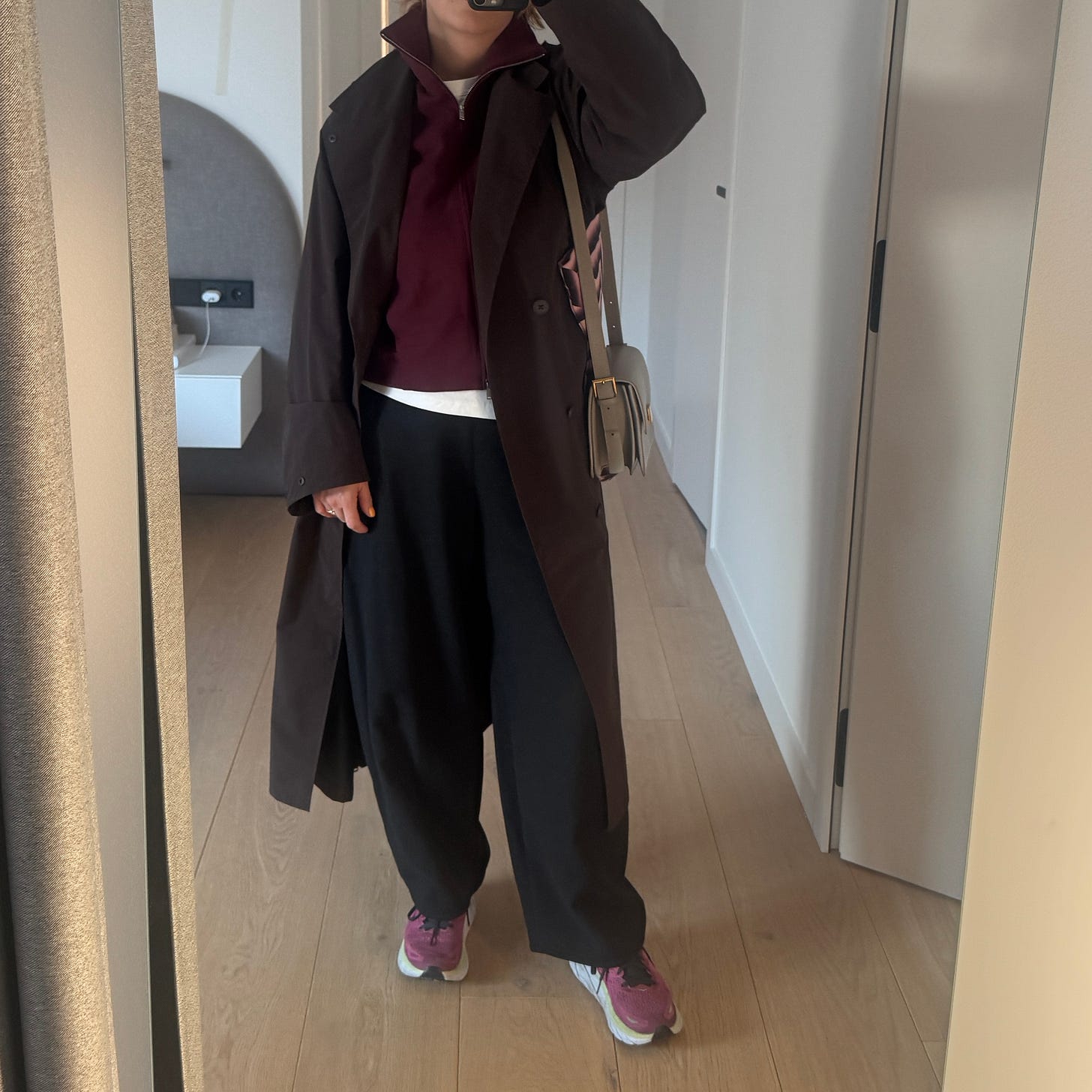 Cos pants, Uniqlo trench, Uniqlo T-shirt, Cos track jacket, The Curated bag
