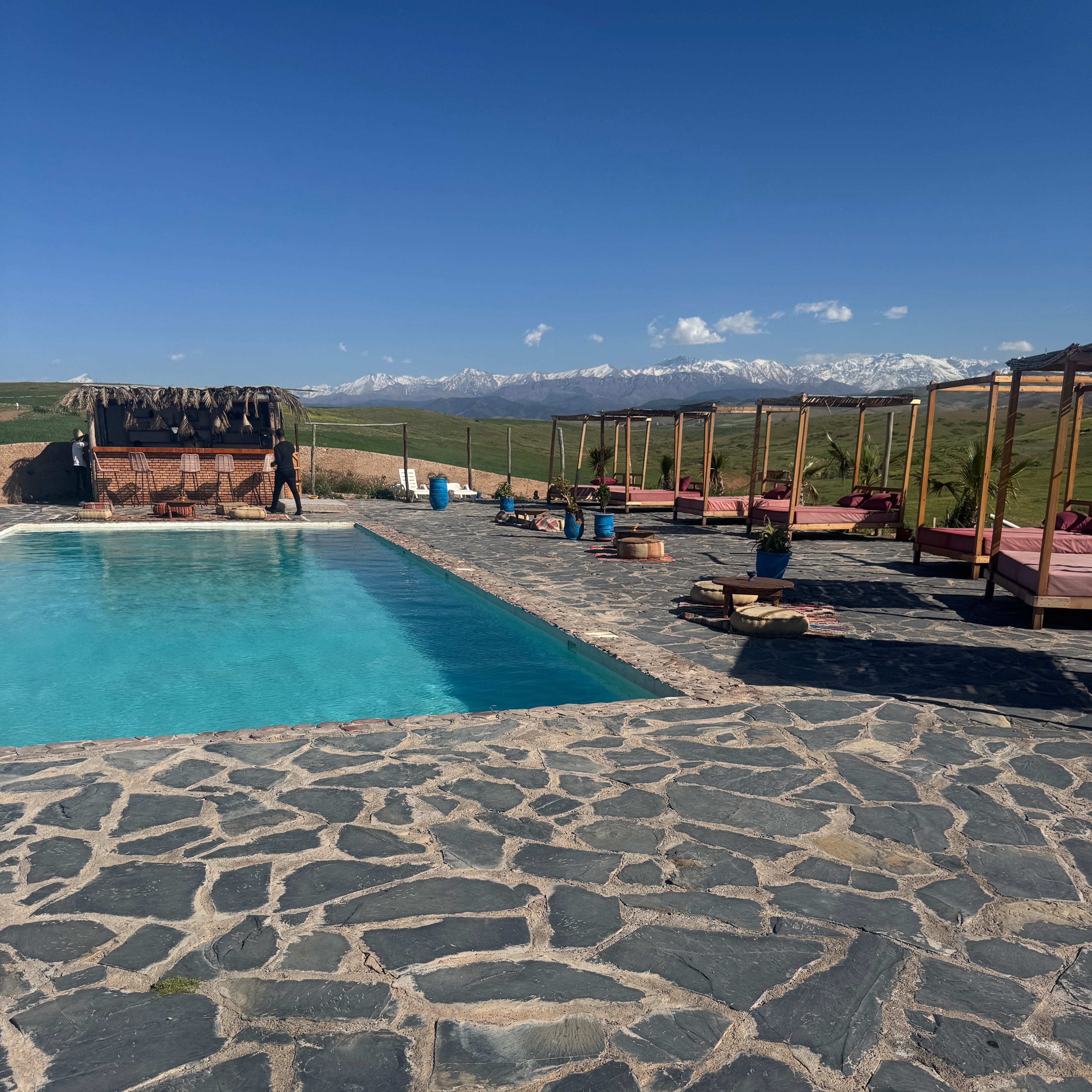 If you see trips to the desert from Marrakech that take just two hours, you are probably going to Agafay, which is not a real desert. The Sahara is an eight-hour drive from Marrakech. As you can see below, the “desert” is green. We stopped at one of the places for a camel ride. It looks like the image below and could be a good option if there is no swimming pool in your area. The real Sahara trip takes about eight hours from Marrakech, so keep that in mind if you want to see the real desert.