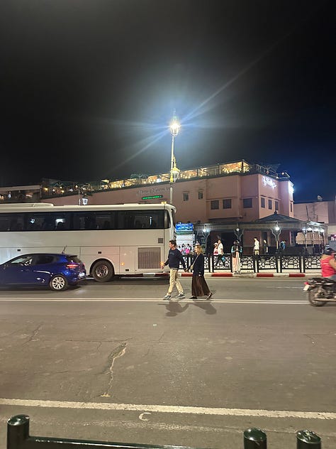 Marrakech can be quite overwhelming. Driving in Marrakech is its own extreme sport, with all kinds of traffic participants pushing their way through. It is common to see a mule in the street on the outskirts of Marrakech, and gazillions of motorcycles and mopeds ignoring traffic lights and squeezing through whenever they can. I had heard stories of random passengers jumping into the back of pickup trucks to get a lift and thought that would not happen to us because we had a closed car. Just then, I looked and saw a couple of roller skaters attached to our car for a faster ride.