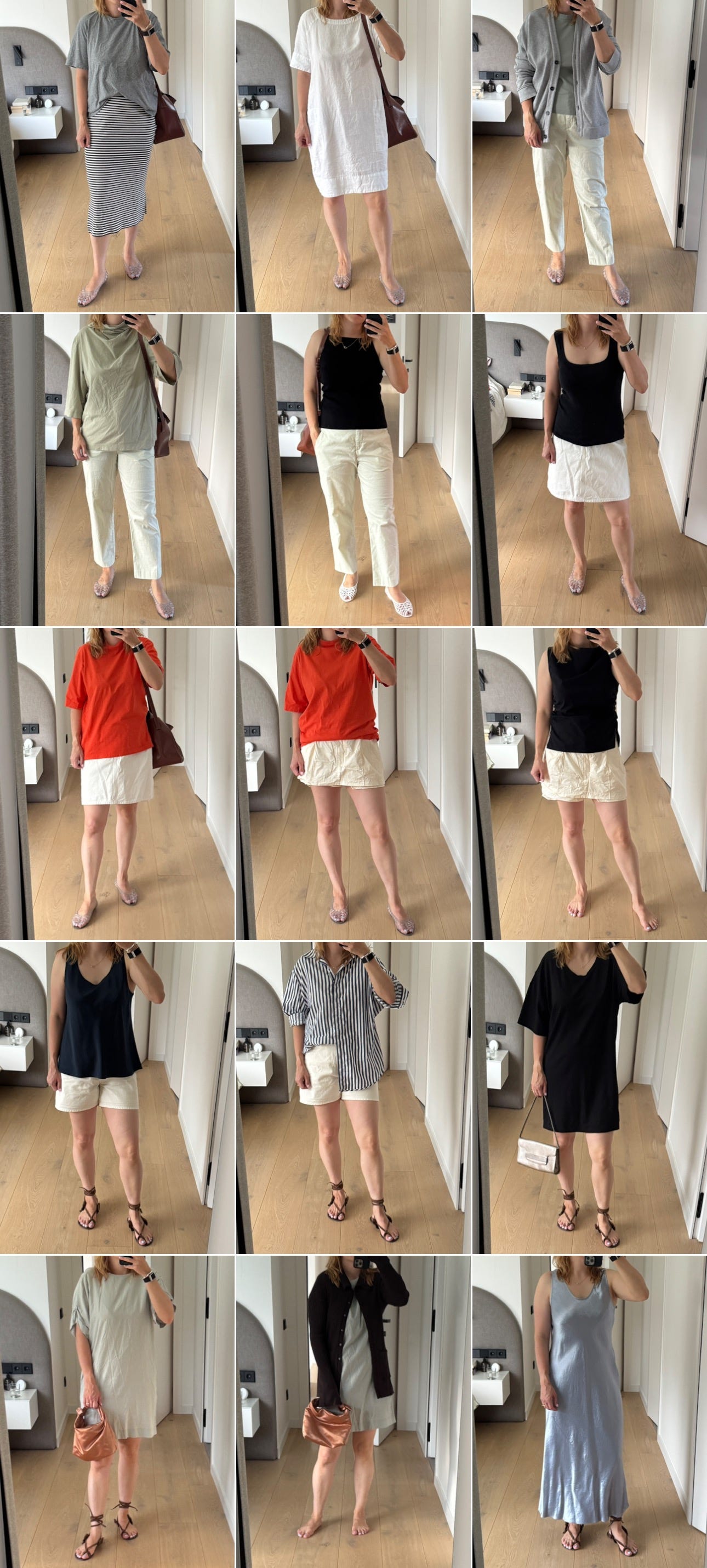 Top row: Tibi T-shirt, Uniqlo satin top (old). Bottom row: The Curated T-shirt, Cos top (all old). All outfits: Arket shorts or skirt (old), Los Angeles Apparel jellies.